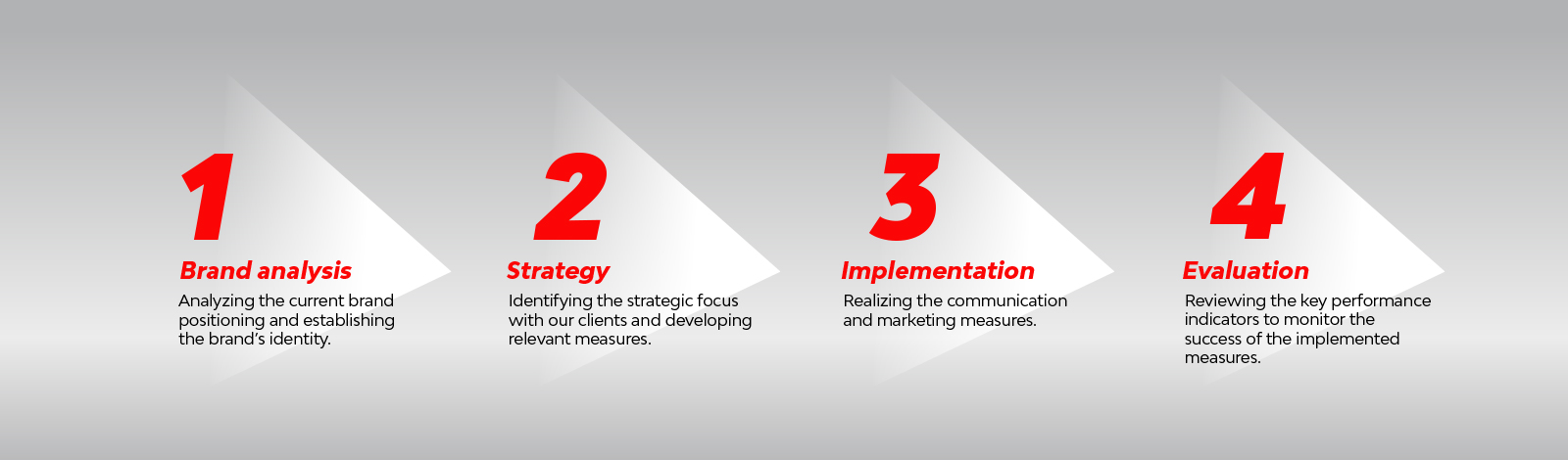 Our four-step work process guarantees coherent and successful project realization. Depending on your individual objective, together we identify all relevant communication and marketing measures.