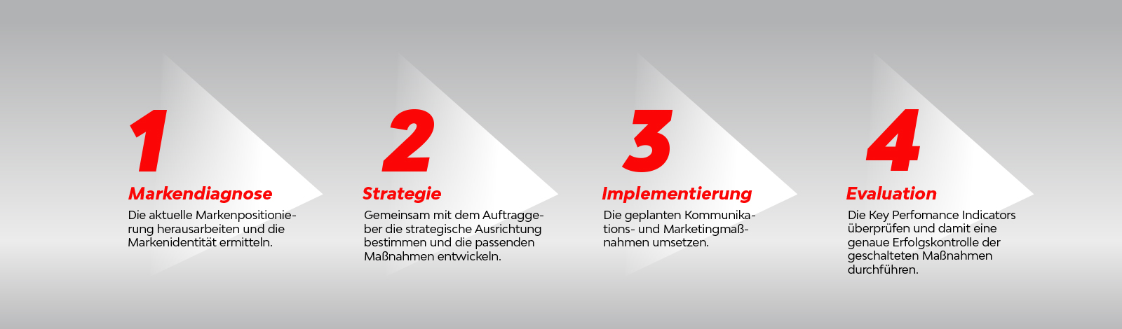 Unser 4-stufiger Arbeitsprozess ist der Garant für eine stringente und erfolgreiche Projektumsetzung. Je nach individueller Zielsetzung bestimmen wir gemeinsam mit Ihnen die passenden Kommunikations- und Marketingmaßnahmen.